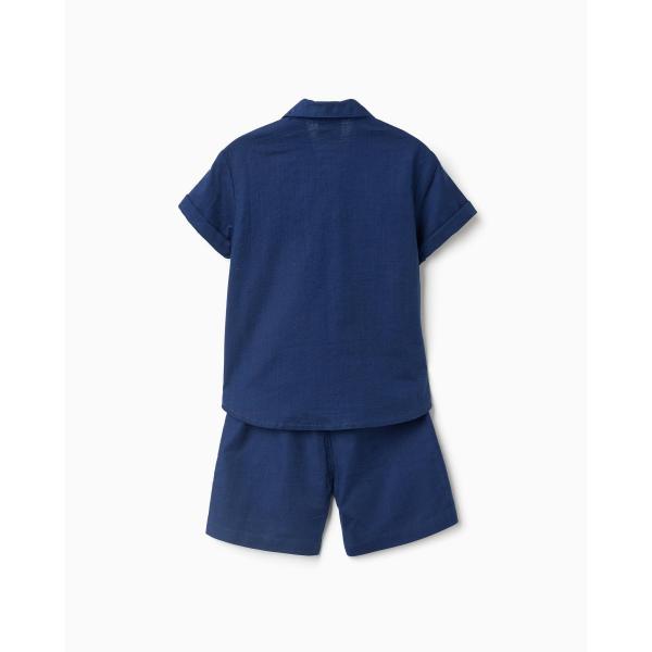 Σετ δύο τεμαχίων για αγοράκια, 100% βαμβάκι. Αποτελείται από ένα μπλε κοντομάνικο πουκάμισο με λαιμόκοψη σε σχήμα V. και ασορτί σορτς, με λάστιχο στη μέση και κορδόνι. Κουμπιά σε ξύλινο στυλ αντίθεσης. Ένα ελαφρύ και άνετο σετ, που φοριέται μαζί ή χωριστά!