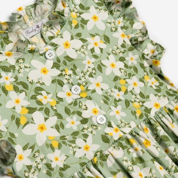 Φόρεμα καλοκαιρινό για κορίτσι, από 1 έως 6 ετών σε χρώμα μέντα, με ολόσωμο τύπωμα, λουλούδια σε λευκό χρώμα με κίτρινες λεπτομέρειες. Κλείνει μπροστά με κουμπάκια. Ποιότητα 100% polyester.