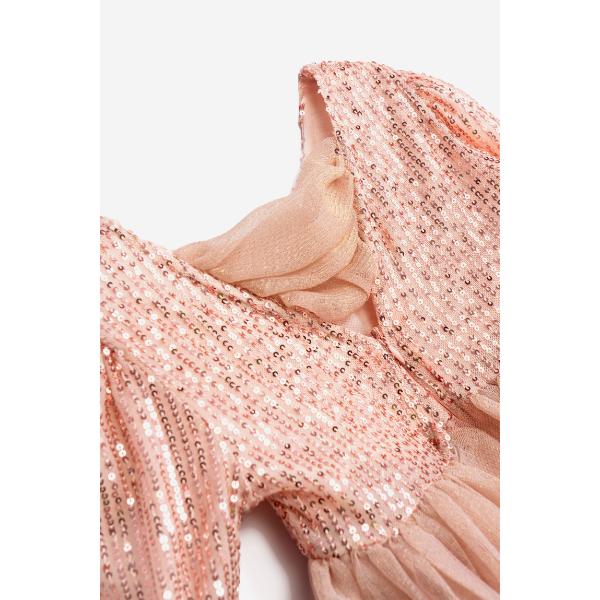 Φόρεμα μακρυμάνικο για κορίτσι από 1 ως 6 ετών. Χρυσή παγιέτα στο πάνω μέρος με διακοσμητικό φιογκάκι και ροζ τούλι στο κάτω μέρος. Κλείνει πίσω με φερμουάρ. Τούλι στις μανσέτες και στη λαιμόκοψη.