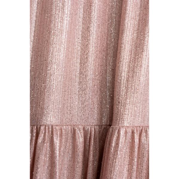 Φόρεμα μακρυμάνικο για κορίτσι από 6 ως 16 ετών, σε χρώμα ροζ με ασημί γκλίτερ. Λάστιχο στις μανσέτες. Κουμπώνει πίσω με φερμουάρ.