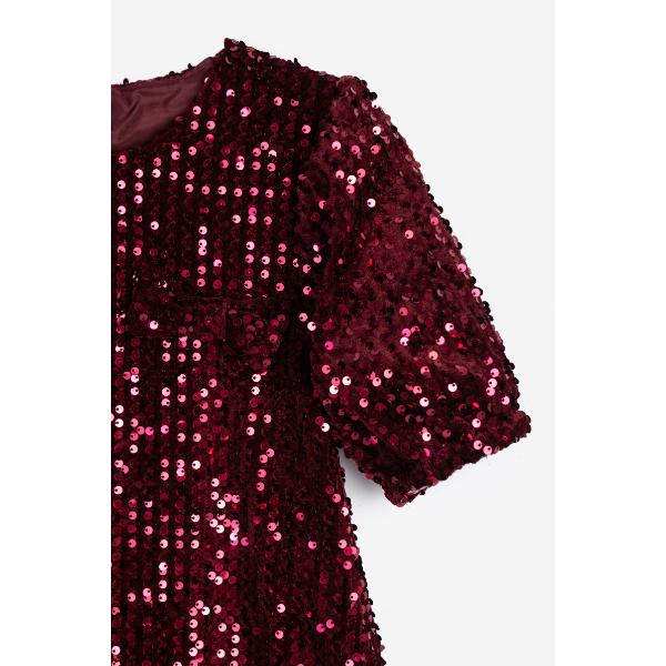 Φόρεμα μακρυμάνικο παγιέτα για κορίτσι από 6 ως 16 ετών, σε χρώμα μπορντό με διακοσμητικό φιογκάκι. Λάστιχο στις μανσέτες.