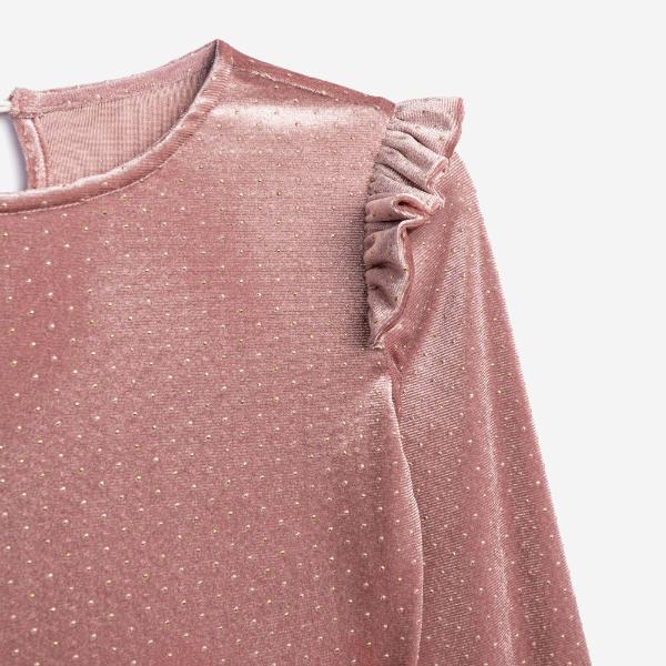 Φόρεμα μακρυμάνικο βελουτέ για κορίτσι, σε ροζ χρώμα, με βολάν στους ώμους.