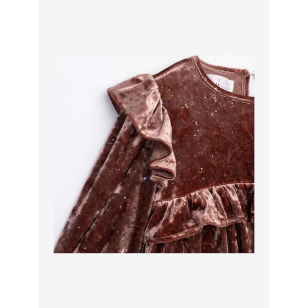 Φόρεμα μακρυμάνικο βελουτέ για κορίτσι, σε σκούρο ροζ χρώμα με πολύχρωμα γκλίτερ και βολάν στους ώμους και στο στήθος.