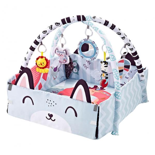 – Παιδικό βαμβακερό και μαλακό χαλάκι με αναδιπλούμενα πλαϊνά και με χαριτωμένη εικονογράφηση από ζωάκια, τα οποία κρατούν συντροφιά στο μωράκι σας. Τα παιδάκια μαθαίνουν το ζωικό βασίλειο παίζοντας με το γυμναστήριο. Το χαλάκι είναι διπλής όψεως.