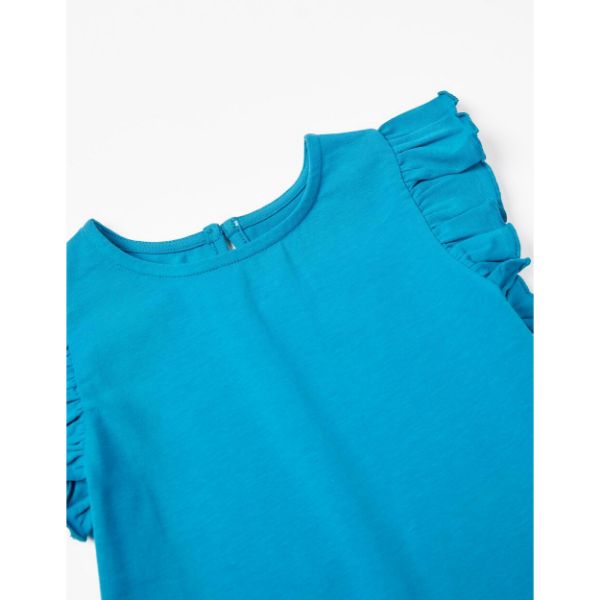 Μπλε αμάνικο μπλουζάκι για κορίτσια, φτιαγμένο από βαμβακερό ζέρσεϊ με μια πινελιά ελαστικότητας για μεγαλύτερη άνεση και ελευθερία κινήσεων. Βολάν στους ώμους. Κουμπί στην πλάτη για εύκολο ντύσιμο. Τυπωμένη εσωτερική ετικέτα για να μην ερεθίζει το δέρμα. Φλογερή εφαρμογή. Μια βασική γκαρνταρόμπα, ταιριάζει με όλα!
