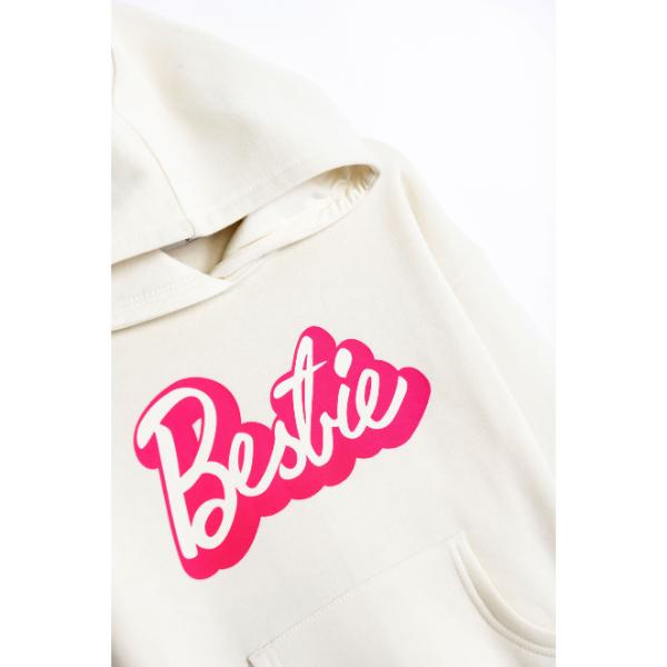 Μπλούζα φούτερ με κουκούλα για κορίτσι σε εκρού χρώμα από 6 ως 16 ετών, με τύπωμα”Bestie”. Φαρδύ λάστιχο στις μανσέτες και στο τελείωμα και μελάλη τσέπη μπροστά.