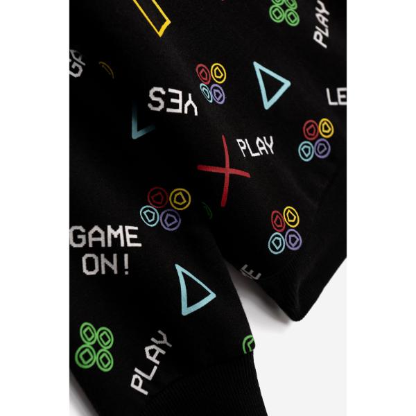 Μπλούζα φούτερ μακρυμάνικη, για αγόρι, σε μαύρο χρώμα με τυπώματα play game. Ριπ τελείωμα στη λαιμόκοψη, τις μανσέτες και κάτω για καλύτερη εφαρμογή.
