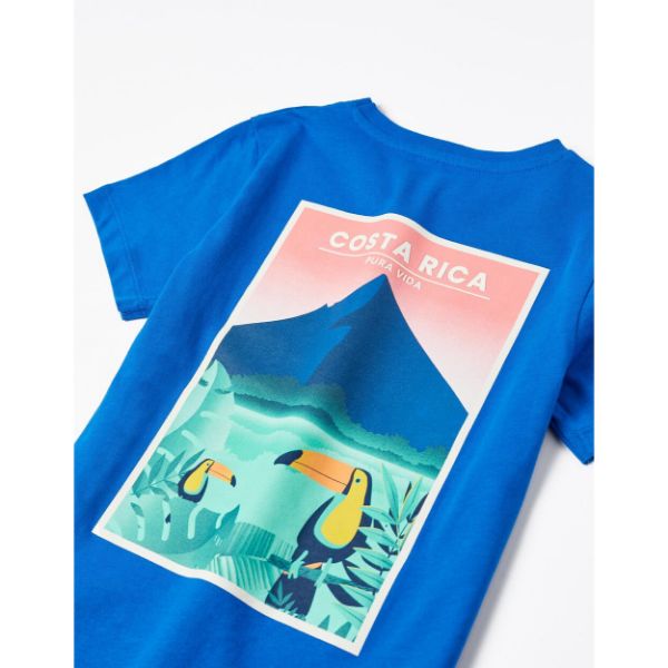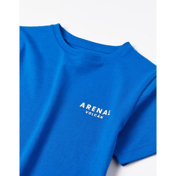 Κοντομάνικο μπλε μπλουζάκι για αγόρια, 100% βαμβάκι. Τυπωμένη εσωτερική ετικέτα για να μην ερεθίζει το δέρμα. Εντυπωσιακό τύπωμα στην πλάτη.