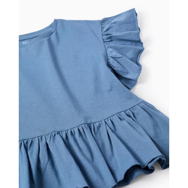 Μπλε μπλουζάκι για κορίτσια, 100% βαμβακερό, με βολάν στο στρίφωμα και στα μανίκια. Ώμοι με πεσμένο αποτέλεσμα. Τυπωμένη εσωτερική ετικέτα για να μην ερεθίζει το δέρμα. Ιδανικό για όλα τα στυλ! We Care: είδος με πιστοποιητικό Oeko-Tex Standard 100, το οποίο εγγυάται την απουσία επιβλαβών ή ερεθιστικών ουσιών για το δέρμα.