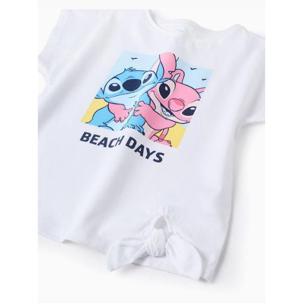 Λευκό μπλουζάκι για κορίτσια, 100% βαμβακερό, με στάμπα μπροστά από το αξιολάτρευτο δίδυμο Stitch and Angel. Μανίκια χωρίς ραφή. Βάση με διακοσμητικό φιόγκο. Τυπωμένη εσωτερική ετικέτα για να μην ερεθίζει το δέρμα. Ένα πρακτικό και άνετο μπλουζάκι παρέα με τον αξιολάτρευτο Stitch!