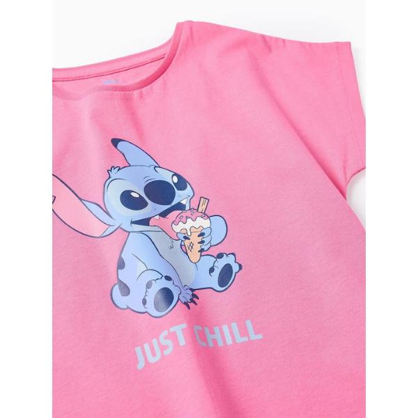 Ροζ μπλουζάκι για κορίτσια, 100% βαμβακερό, με μπροστινή στάμπα Stitch. Μανίκια χωρίς ραφή. Τυπωμένη εσωτερική ετικέτα για να μην ερεθίζει το δέρμα. Ένα πρακτικό και άνετο μπλουζάκι παρέα με τον αξιολάτρευτο Stitch!