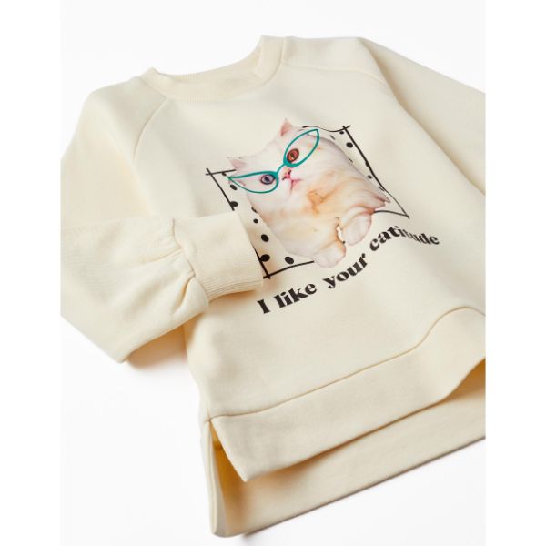 Ανοιχτό μπεζ φούτερ για κορίτσια, με βουρτσισμένο εσωτερικό για μεγαλύτερη θερμική άνεση. Μπροστινή εκτύπωση. Ελαφρώς φουσκωμένα μανίκια. Ριμπ γιακά και μανσέτες για καλύτερη εφαρμογή. Ασύμμετρη βάση, μακρύτερη στο πίσω μέρος και με πλαϊνά ανοίγματα. Ένα πρωτότυπο και άνετο φούτερ για καθημερινή χρήση. We Care: προϊόν με πιστοποίηση Oeko-Tex Standard 100, που εγγυάται την απουσία επιβλαβών ή ερεθιστικών ουσιών για το δέρμα.