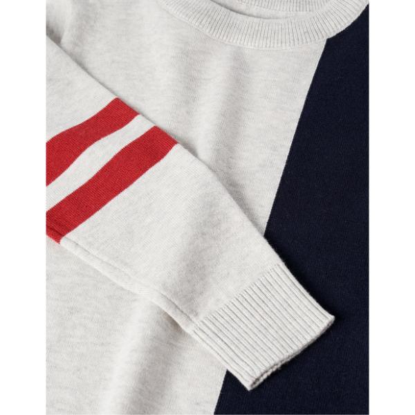 Λεπτό μπλουζάκι για αγόρια, κατασκευασμένο από μείγμα βαμβακιού. Σε αποχρώσεις του γκρι και του σκούρου μπλε με λεπτομέρεια με κόκκινη ρίγα σε ένα από τα μανίκια. Στρογγυλή λαιμόκοψη και ριμπ μανσέτες για τέλεια εφαρμογή. Διακοσμητική ετικέτα στη βάση. Ένα κλασικό και άνετο jumper, ιδανικό για κάθε περίσταση.