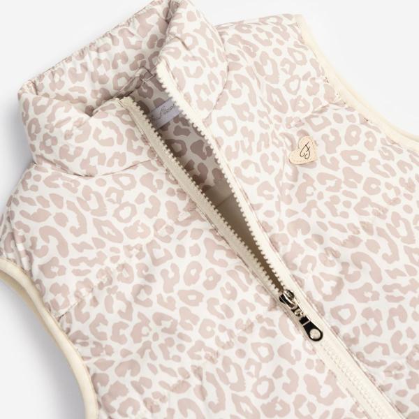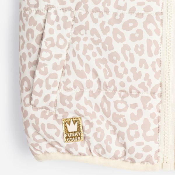 Μπουφάν αμάνικο για κορίτσι 1 εώς 6 ετών, εκρού μπεζ αποχρώσεις σχέδιο animal . Κλείνει μπροστά με φερμουάρ. Δύο πλάγιες τσέπες.