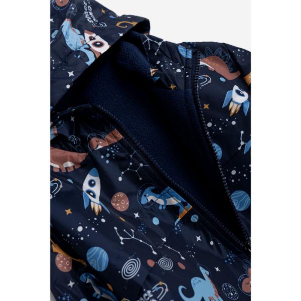 Τζάκετ για αγόρι από 1 έως 6 ετών σε χρώμα μπλε, με ολόσωμο τύπωμα δεινοσαύρους στο διάστημα. Κλείνει μπροστά με φερμουάρ.