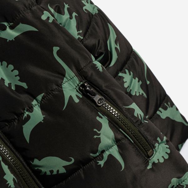 Μπουφάν για αγόρι από 1 έως 6 ετών σε χρώμα χακί, με κουκούλα. Φλις ζεστή επένδυση και τύπωμα δεινόσαυροι. Κλείνει μπροστά με φερμουάρ.