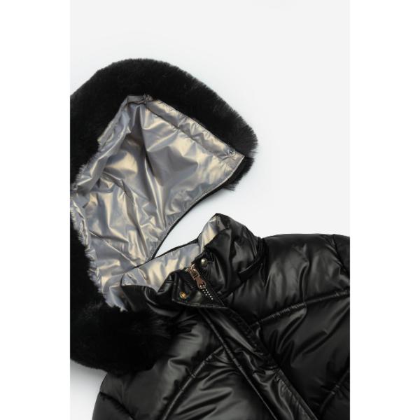 Μπουφάν για κορίτσι 6 έως 16 ετών, σε μαύρο χρώμα. Γούνινη επένδυση εσωτερικά, αποσπώμενη κουκούλα και αποσπώμενη γούνα στη κουκούλα. Κλείνει με κρυφό φερμουάρ, δύο τσέπες που κλείνουν με φερμουάρ.