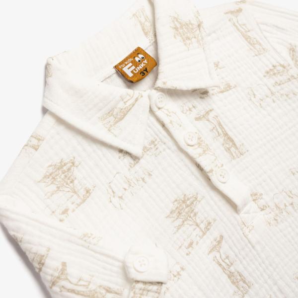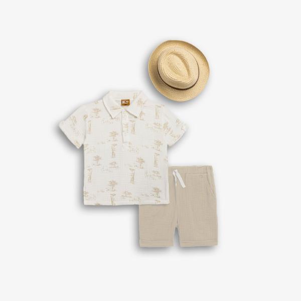 Σετ 3τμχ βαμβακερό, για αγόρι από 2 έως 6 ετών. Μπλούζα κοντομάνικη, σε χρώμα εκρού, με ολόσωμο τύπωμα, γιακά και κουμπάκια. Σορτς σε χρώμα μπεζ και καπέλο ψάθινο.