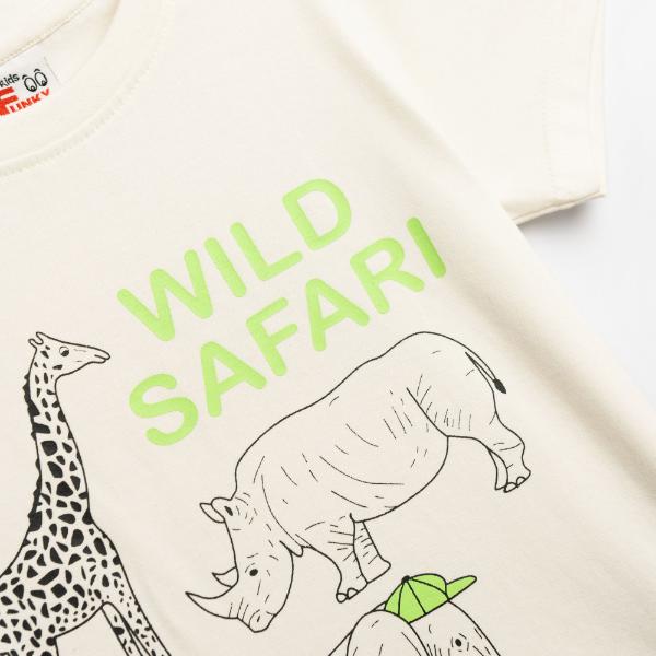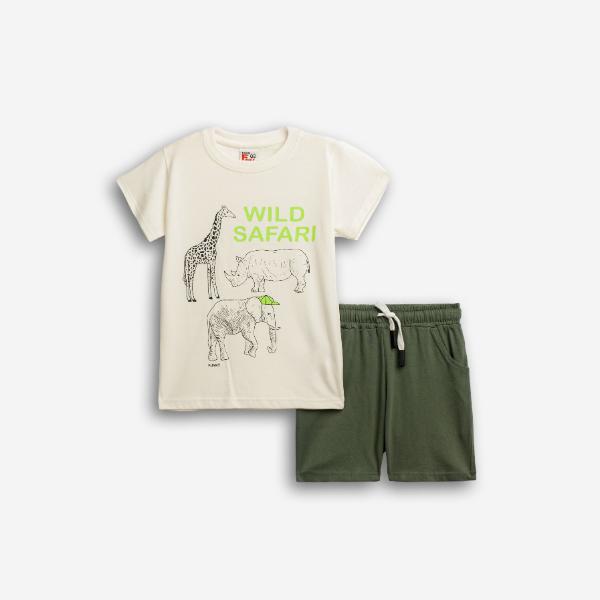 Σετ για αγόρι από 2 έως 6 ετών. Μπλούζα μακό κοντομάνικη, σε χρώμα εκρού, με τύπωμα μπροστά ζωάκια. Σορτς μακό, σε χρώμα χακί με λάστιχο και κορδόνι στη μέση.