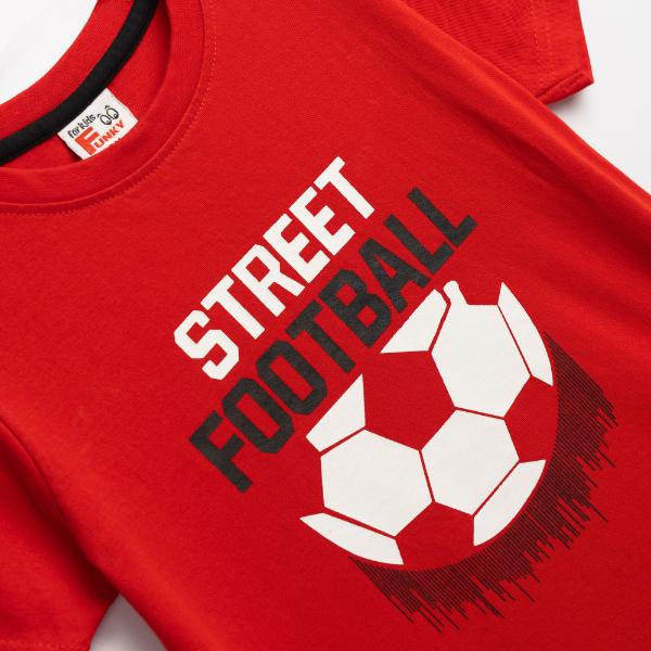 Σετ για αγόρι από 2 έως 6 ετών. Μπλούζα μακό κοντομάνικη, σε χρώμα κόκκινο, με τύπωμα μπάλα ποδοσφαίρου. Σορτς μακό, σε χρώμα μαύρο με τύπωμα, λάστιχο και κορδόνι στη μέση.