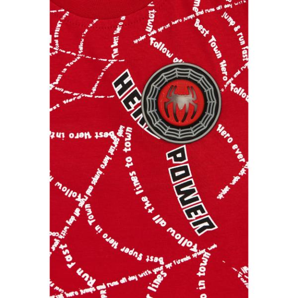 Σετ δύο τεμαχίων για αγόρια, 100% βαμβάκι. Περιλαμβάνει ένα κόκκινο μπλουζάκι, κοντομάνικο,με φωτάκι και ολόσωμο τύπωμα σχετικό με τον Spiderman, μαύρο σορτς με λάστιχο και κορδόνι στη μέση.
