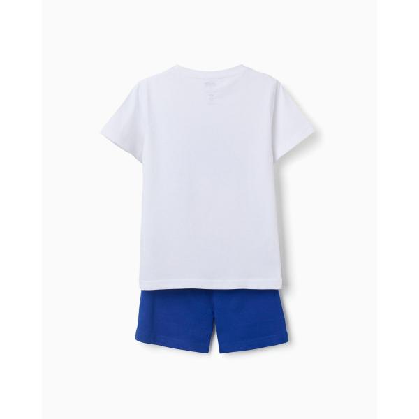 Παιδικό σετ πιτζάμες για αγόρι, 100% βαμβάκι, με στάμπα Sonic. Μπλούζα μακό, κοντομάνικη, σε χρώμα λευκό με τύπωμα Sonic και σορτς μακό σε χρώμα μπλε.