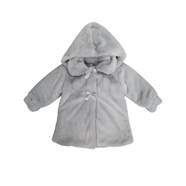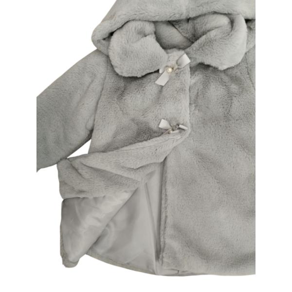 Γούνα για κορίτσι σε γκρι χρώμα με αποσπώμενη κουκούλα, εσωτερική φόδρα και γιακά.