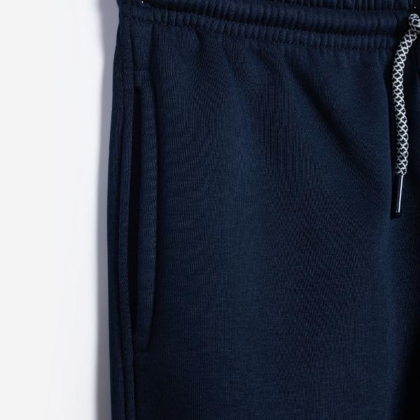 Παντελόνι φούτερ για αγόρι, σε χρώμα μπλε. Λάστιχο και κορδόνι στη μέση, τσέπες και ριπ τελείωμα στο ποδόγυρο.