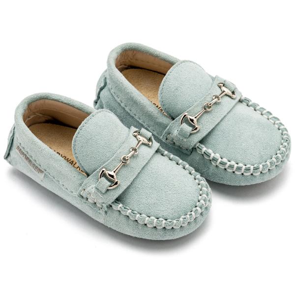 Καστόρινα loafer με μεταλλική διακοσμητική αγκράφα, σε γαλάζιο χρώμα.