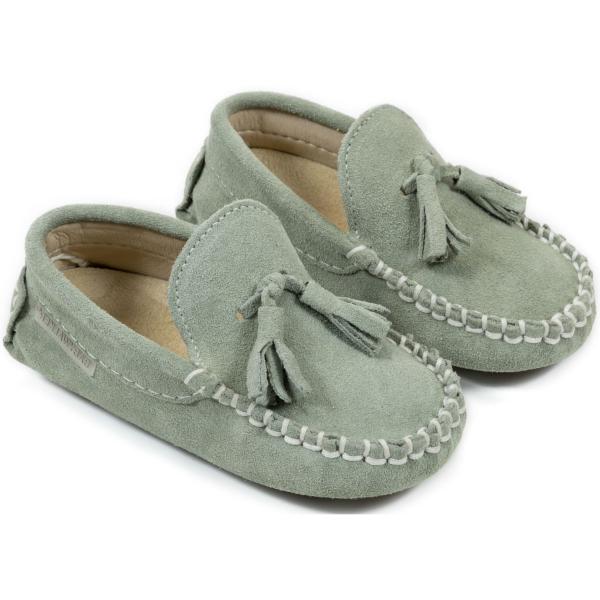 Καστόρινο μοκασίνι με φουντάκια από δέρμα κρούτα suede σε Μέντα χρώμα.