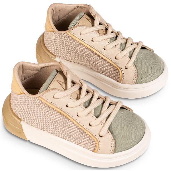Δίχρωμο δετό σνίκερ από ύφασμα και δέρμα, σε μπεζ μέντα χρώμα.