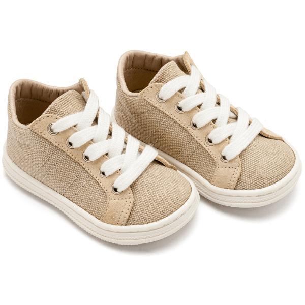 Υφασμάτινα δετά σνίκερ από ύφασμα και δέρμα, σε μπεζ χρώμα.