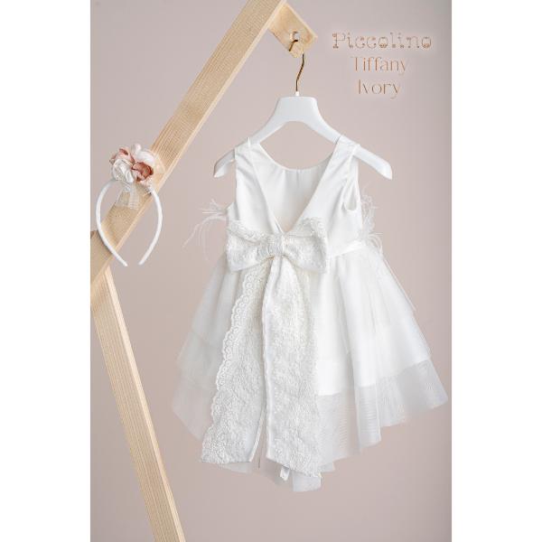 Βαπτιστικό φόρεμα Piccolino Tiffany σε χρώμα ivory. Φόρεμα μεσάτο με μπούστο από σατέν. Ζωνάκι απο δαντέλα και μαραμπού πούπουλα διακοσμημένο από χειροποίητα λουλουδάκια. Τούλινη φούστα με βολάν σε 3 επίπεδα με μακρυά ουρά. Στο πίσω μέρος εντυπωσιάζει ο μεγάλος δετός φιόγκος από δαντέλα. Το φόρεμα συνοδεύεται από στέκα με ντεκόρ όμοιο με το φόρεμα.