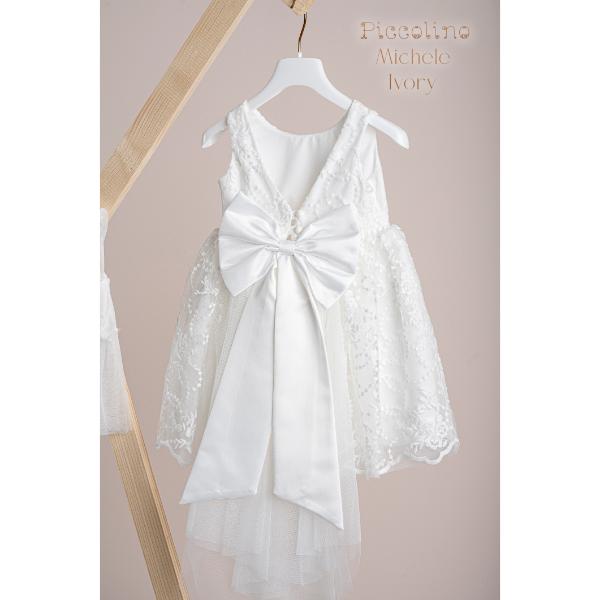 Βαπτιστικό φόρεμα Piccolino Michele Ivory, Φόρεμα από δαντέλα με όμορφο τελείωμα στο κάτω μέρος, η εντυπωσιακή του πλάτη καταλήγει σε V και την διακοσμεί ένας σατέν φιόγκος κάτω από τον οποίο υπάρχει μία τούλινη ουρά. Το ντεκόρ του φορέματος αποτελείται από χειροποίητα λουλούδια. Το φόρεμα συνοδεύεται από κορδέλα με ντεκόρ όμοιο με το φόρεμα.