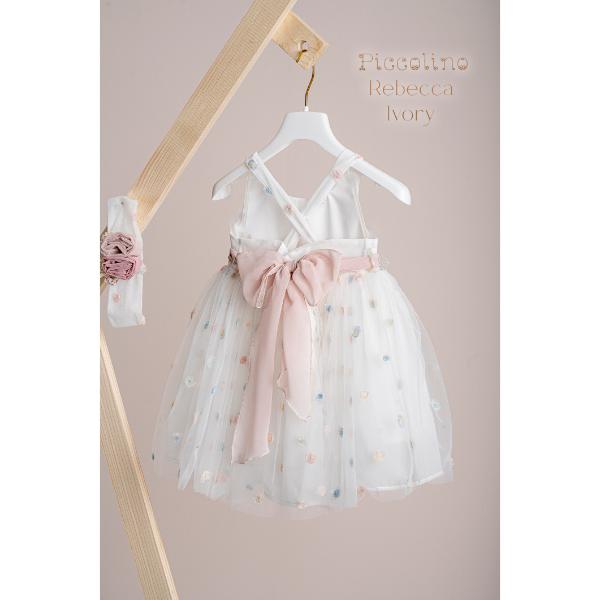 Βαπτιστικό φόρεμα Piccolino Rebecca Ivory. Φόρεμα από εκρού τούλι με κεντημένα χρωματιστά λουλουδάκια. Πλάτη με δέσιμο χιαστί από τις τιράντες και ανάλαφρο χρωματιστό ζωνάκι που καταλήγει σε έναν ανέμελο φιόγκο πίσω στην πλάτη. Το ντεκόρ του φορέματος αποτελείται από χειροποίητα λουλούδια περλίτσες και boho κορδόνι. Το φόρεμα συνοδεύεται από κορδέλα με ντεκόρ όμοιο με το φόρεμα.