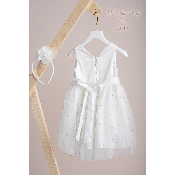 Βαπτιστικό φόρεμα Piccolino Zoe Ivory. Φόρεμα μεσάτο με ένα ιδιαίτερα γοητευτικό μπούστο με πιέτες από σατέν με ζωνάκι από σατέν που καταλήγει σε δέσιμο φιογκάκι πίσω στην πλάτη. Εντυπωσιακή ασύμμετρη τούλινη φούστα με πέρλες, με πιο μακρύ το πίσω μέρος της. Το ντεκόρ του φορέματος αποτελείται από χειροποίητο λουλούδι, στρας και μαραμπού. Το φόρεμα συνοδεύεται από στέκα με ντεκόρ όμοιο με το φόρεμα.