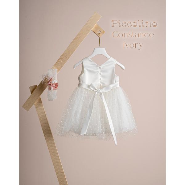 Βαπτιστικό φόρεμα Piccolino Constance Ivory. Φόρεμα μεσάτο με ένα ιδιαίτερα γοητευτικό μπούστο με πιέτες από σατέν με ζωνάκι από σατέν που καταλήγει σε δέσιμο φιογκάκι πίσω στην πλάτη. Εντυπωσιακή ασύμμετρη τούλινη φούστα με ανάγλυφο πουά, με πιο μακρύ το πίσω μέρος της. Το ντεκόρ του φορέματος αποτελείται από χειροποίητα λουλούδια και μαραμπού. Το φόρεμα συνοδεύεται από κορδέλα με ντεκόρ όμοιο με το φόρεμα.