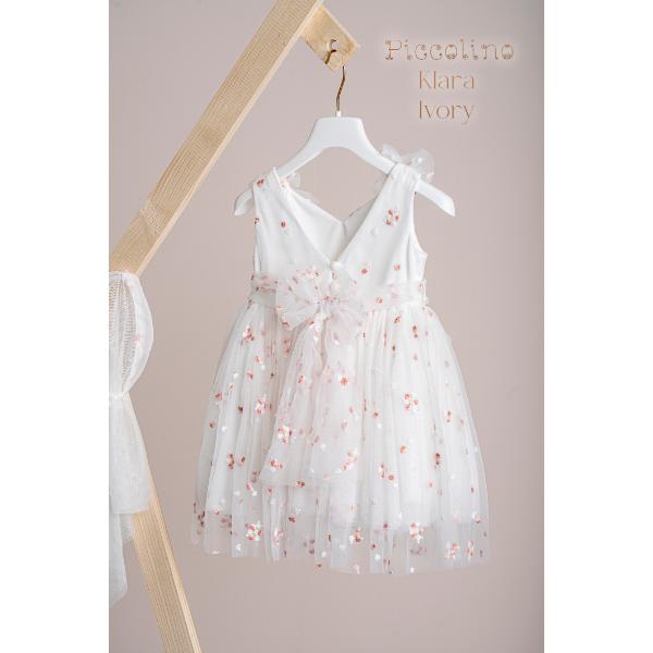 Βαπτιστικό φόρεμα Piccolino Klara Ivory. Φόρεμα από ανάγλυφη με λουλουδάκια δαντέλα με λαιμόκοψη σε σχήμα καρδιάς και πλάτη σε σχήμα V. Δύο φιογκάκια από την δαντέλα του φορέματος διακοσμούν τους ώμους και ζωνάκι από την δαντέλα με δέσιμο που καταλήγει σε φιογκάκι στο πίσω μέρος διακοσμεί την μέση. Το ντεκόρ του φορέματος αποτελείται από χειροποίητα λουλούδια, περλίτσες και πούπουλα μαραμπού. Το φόρεμα συνοδεύεται από μπαντάνα με ντεκόρ όμοιο με το φόρεμα.