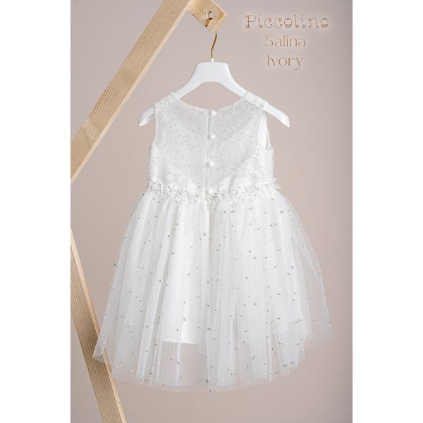 Βαπτιστικό φόρεμα Piccolino Salina Ivory. Φόρεμα μεσάτο με μπούστο από δαντέλα ανάγλυφη με στρας και σχηματισμό σε κόψιμο καρδιάς, με διακριτική διαφάνεια. Πλάτη με διαφάνεια και δαντέλα με στρας. Αστραφτερό ζωνάκι και ασύμμετρη τούλινη φούστα με πέρλες. Το ντεκόρ του φορέματος αποτελείται από χειροποίητο λουλούδι. Το φόρεμα συνοδεύεται από μπαντάνα με ντεκόρ όμοιο με το φόρεμα.