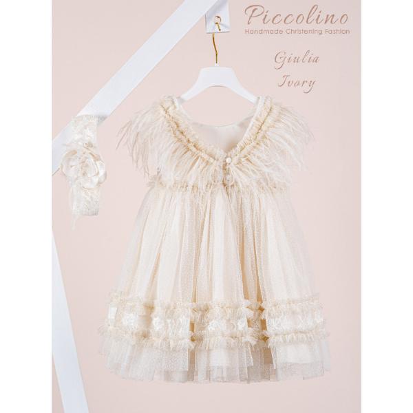 Βαπτιστικό φόρεμα Piccolino Giulia Ivory. Εντυπωσιακό ιβουάρ φόρεμα με χρυσές λεπτομέρειες. Ρομαντικό μπούστο από δαντέλα και τούλι με γκλίτερ κάτω από αυτήν, μανικάκι με πούπουλα μαραμπού και λεπτομέρεια από τούλι με χρυσό γκλίτερ. Η φούστα του φορέματος αποτελείται από πουά τούλι και τούλι με γκλίτερ από κάτω, βολάν από τούλι με γκλίτερ και λεπτομέρεια με δαντέλα όμοια με το μπούστο. Εξίσου εντυπωσιακή είναι και η πλάτη του φορέματος που σχηματίζει V κάνοντας σούρα με τούλι γκλίτερ και πούπουλα μαραμπού. Το ντεκόρ του φορέματος αποτελείται από χειροποίητο λουλούδι. Το φόρεμα συνοδεύεται από κορδέλα με ντεκόρ όμοιο με το φόρεμα. Διαθέσιμο σε 4 μεγέθη: 6-12, 12-18, 18-24, 24-36(εξτρά χρέωση)