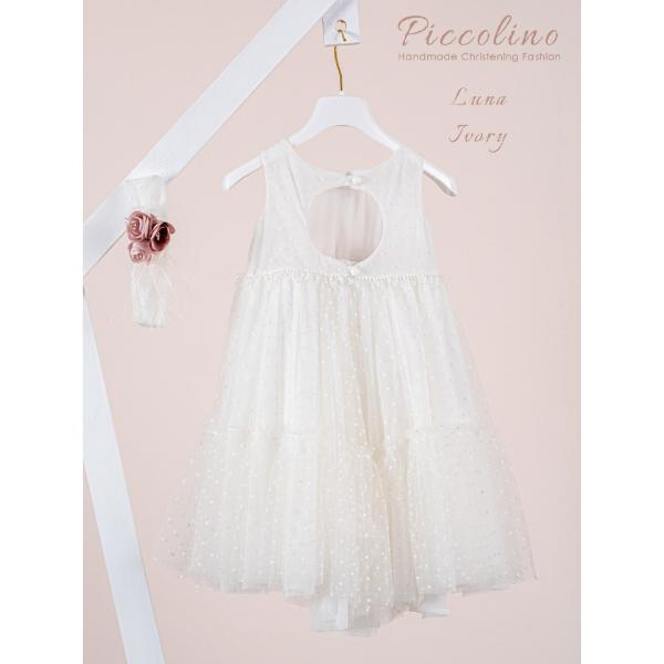 Βαπτιστικό φόρεμα Piccolino Luna Ivory. Ρομαντικό μακρύ φόρεμα με πουά τούλι. Το ντεκόρ του φορέματος αποτελείται από διακριτικό ζωνάκι με κρόσσια, χειροποίητα λουλούδια και πούπουλα μαραμπού. Το φόρεμα συνοδεύεται από κορδέλα με ντεκόρ όμοιο με το φόρεμα. Διαθέσιμο σε 4 μεγέθη: 6-12, 12-18, 18-24, 24-36(εξτρά χρέωση)