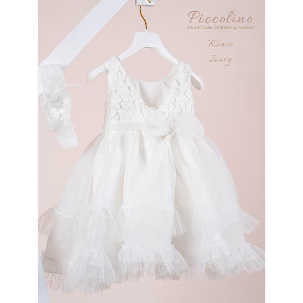 Βαπτιστικό φόρεμα Piccolino Renee Ivory. Ρομαντικό μεσάτο φόρεμα με μπούστο από εντυπωσιακή δαντέλα με λουλούδια και πλούσια φούστα από οργάντζα με βολάν από πουά τούλι. Το ντεκόρ του φορέματος αποτελείται από σύνθεση με λουλούδια της δαντέλας και ζωνάκι από πουά τούλι που καταλήγει σε φιόκο στο πίσω μέρος. Το φόρεμα συνοδεύεται από κορδέλα με ντεκόρ όμοιο με το φόρεμα. Διαθέσιμο σε 4 μεγέθη: 6-12, 12-18, 18-24, 24-36(εξτρά χρέωση).