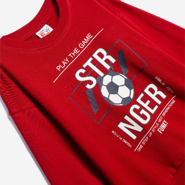 Σετ φόρμες αχνούδιαστες για αγόρι. Μπλούζα σε κόκκινο χρώμα με τύπωμα μπροστά μπάλα ποδοσφαίρου. Παντελόνι φόρμας, σε μπλε χρώμα, λάστιχο και κορδόνι στη μέση, ριπ τελείωμα στο ποδόγυρο.