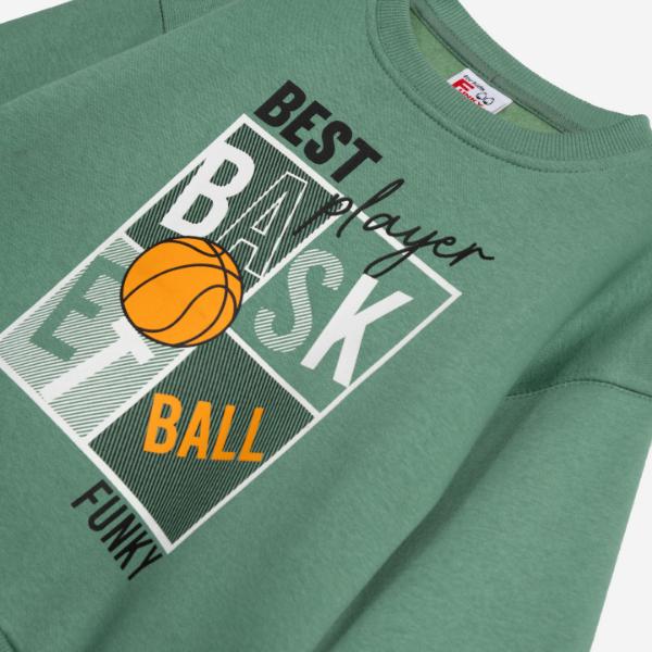 Σετ φόρμα φούτερ για αγόρι από 2 ως 6 ετών . Μπλούζα σε χρώμα πράσινο με τύπωμα μπροστά μπάλα μπάσκετ και ριπ τελείωμα στη λαιμόκοψη και στις μανσέτες για πιο εύκολη εφαρμογή. Παντελόνι σε μαύρο χρώμα με λάστιχο και κορδόνι στη μέση.