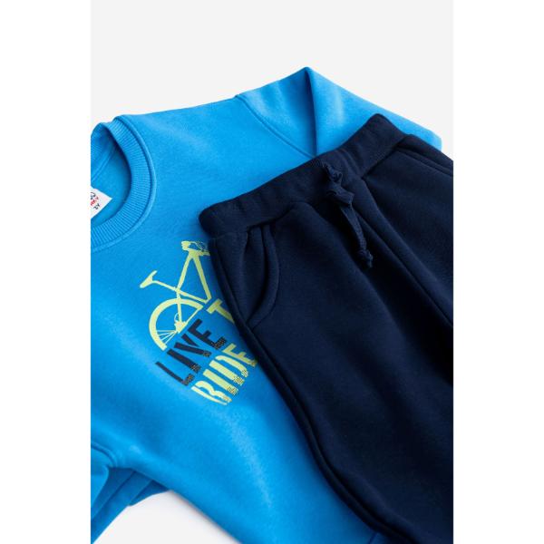 Σετ φόρμες φούτερ για αγόρι από 1 ως 6 ετών. Μπλούζα σε χρώμα κυανό μπλε με τύπωμα μπροστά. Παντελόνι φόρμας σε χρώμα σκούρο μπλε.