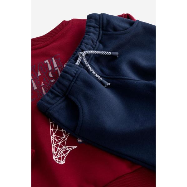 Σετ φόρμες φούτερ για αγόρι από 1 ως 6 ετών. Μπλούζα σε χρώμα μπορντό  με τύπωμα  στο πίσω μέρος. Παντελόνι φόρμας σε χρώμα σκούρο μπλε.
