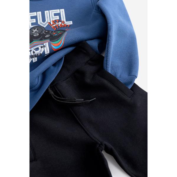 Σετ φόρμες φούτερ για αγόρι από 1 ως 6 ετών. Μπλούζα σε χρώμα ραφ με τύπωμα μπροστά. Παντελόνι φόρμας σε χρώμα μαύρο.