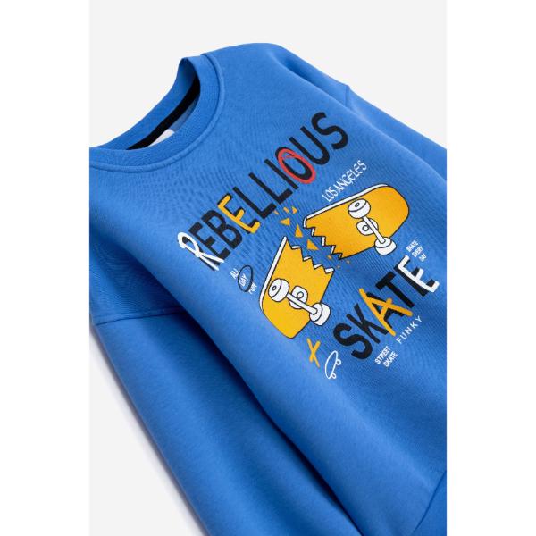 Σετ φόρμες φούτερ για αγόρι από 1 ως 6 ετών. Μπλούζα σε χρώμα riviera blue με τύπωμα μπροστά. Παντελόνι φόρμας σε χρώμα μαύρο.