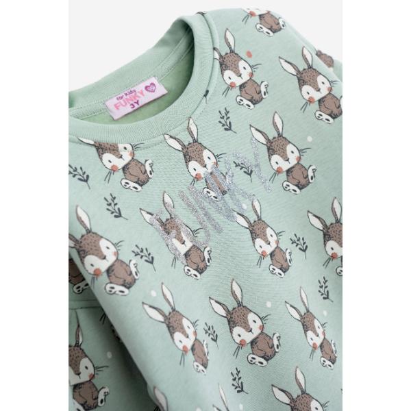 Σετ φόρμες φούτερ για κορίτσι από 1 ως 6 ετών, σε χρώμα φυστικί-ανθρακί με τύπωμα λαγουδάκια