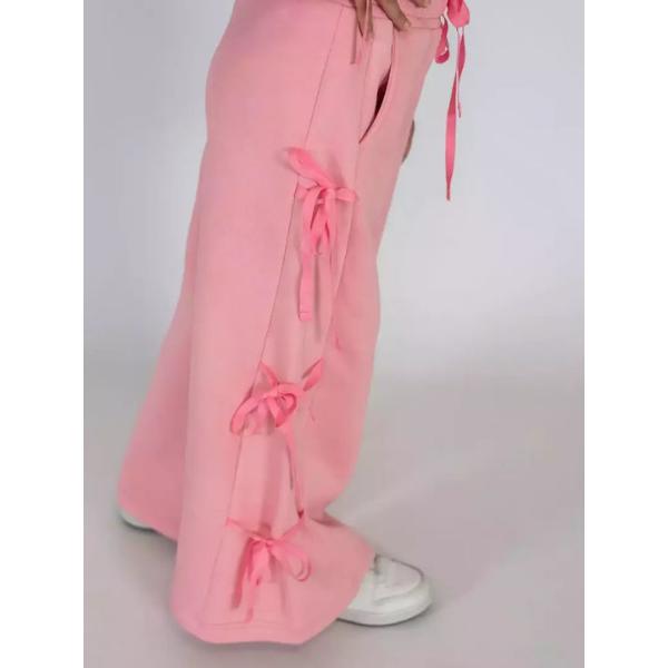 Σετ φόρμες φούτερ για κορίτσι σε χρώμα ροζ. Crop top με κορδονάκια που σουρώνουν στο τελείωμα, ημίψηλο γιακά. Παντελόνα με κορδόνι και λάστιχο στη μέση, διακοσμητικά κορδονάκια στα πλαϊνά.